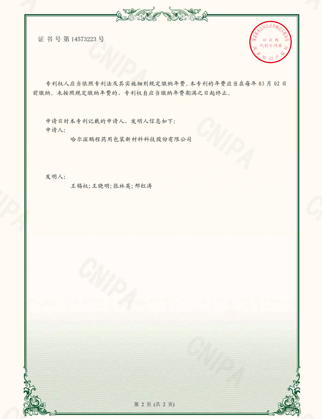 專利 權 人:哈爾濱鵬程藥用包裝新材料科技股份有限公司