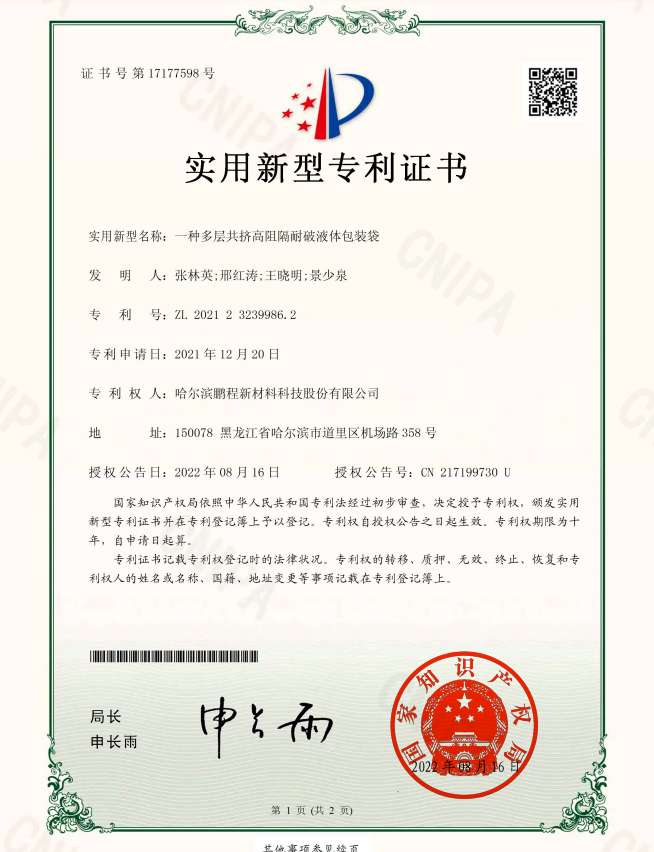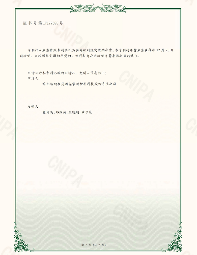 專利 權人:哈爾濱鵬程新材料科技股份有限公司