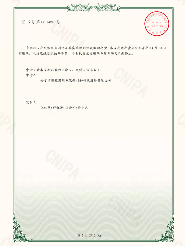 專利權人:哈爾濱鵬程藥用包裝新材料科技股份有限公司