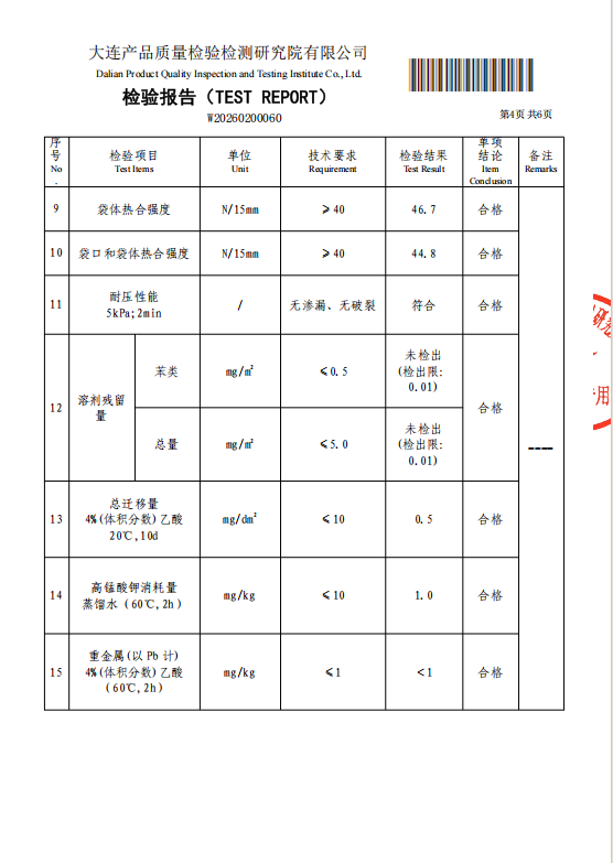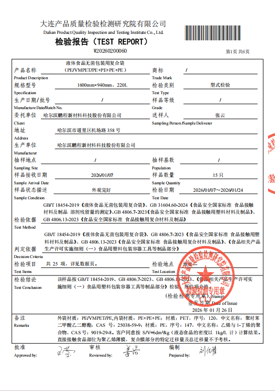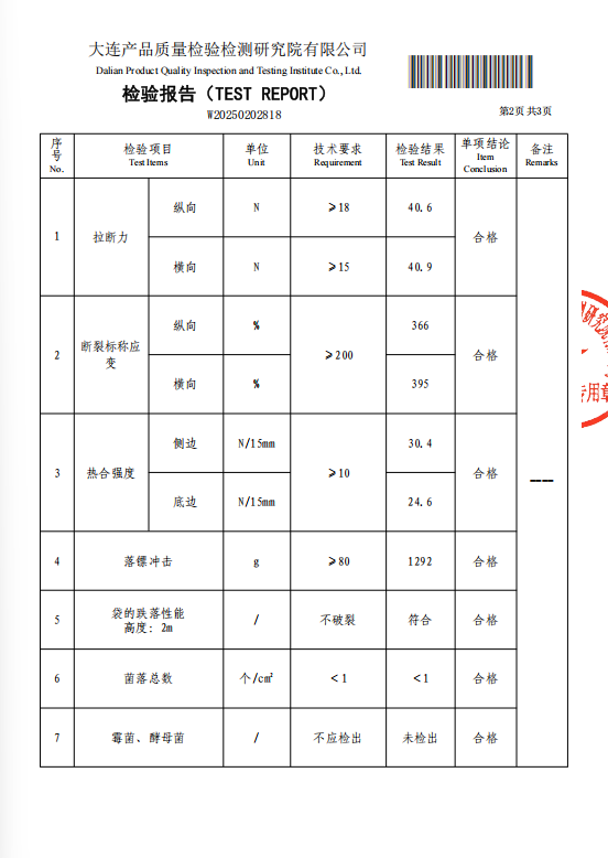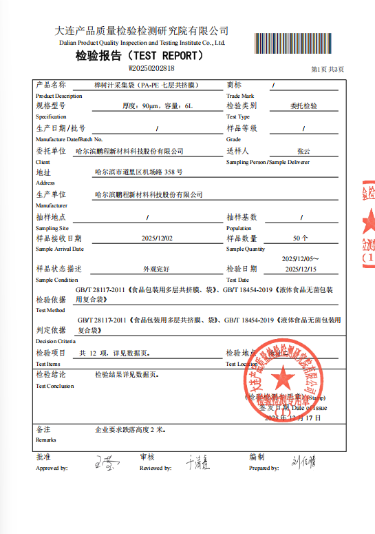 注:該樺樹汁采集袋抗跌落數據遠高于國家標準(0.8m1次),標準號:GB/T28117-2011《食品包裝用多層共擠膜、袋》